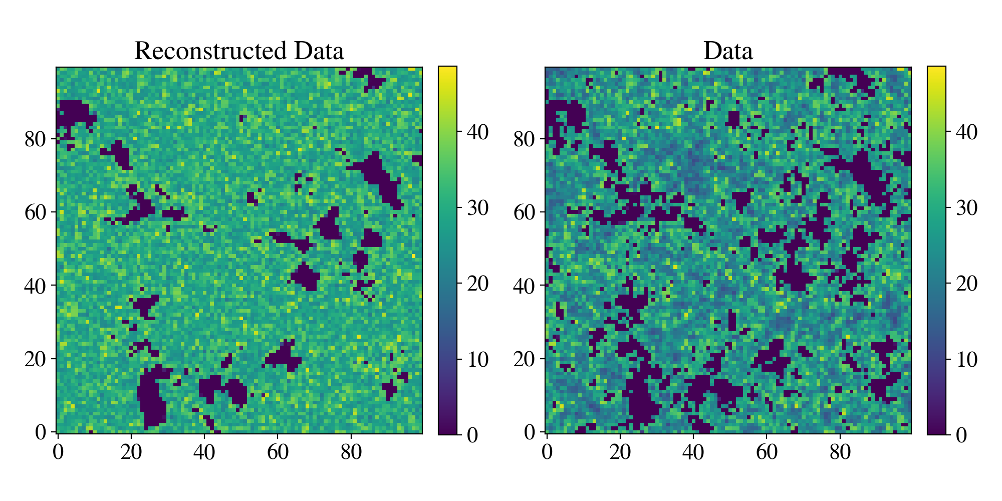 Output reconstructed map of the 21 cm brightness temperature from an HMC with 10k+ parameters (yes, that means 10k+ posteriors)! Recovery on small scales are still difficult — let me know how you recover small scales :)